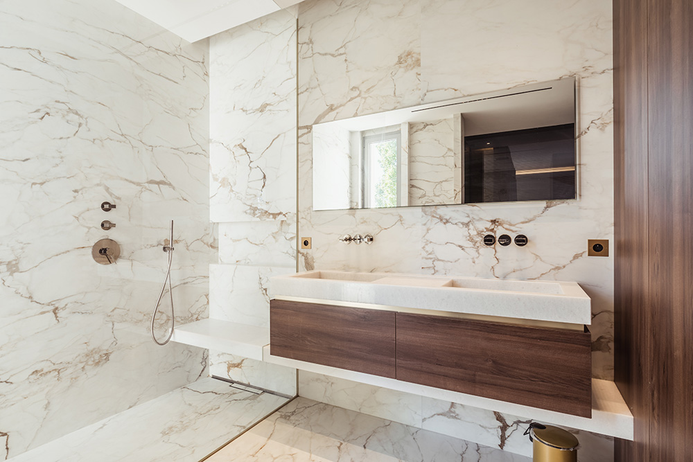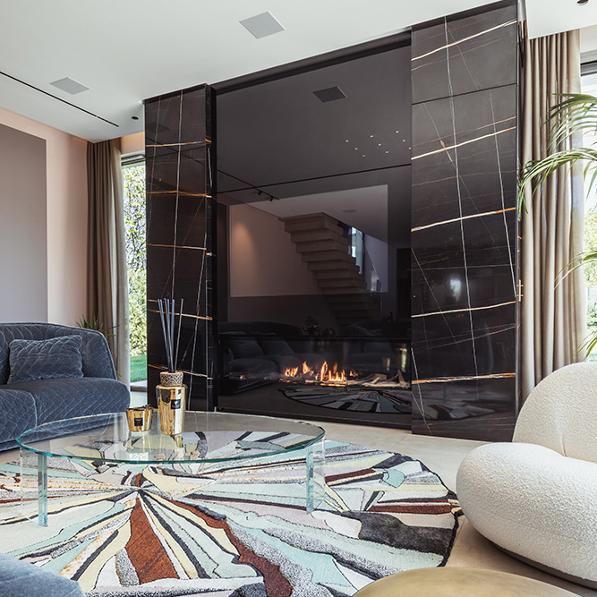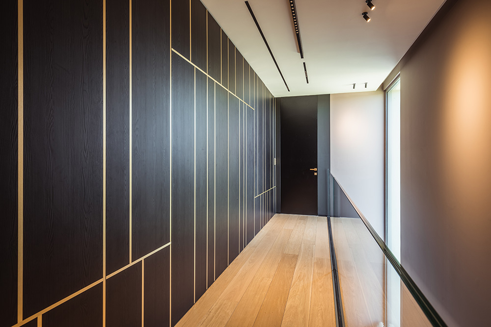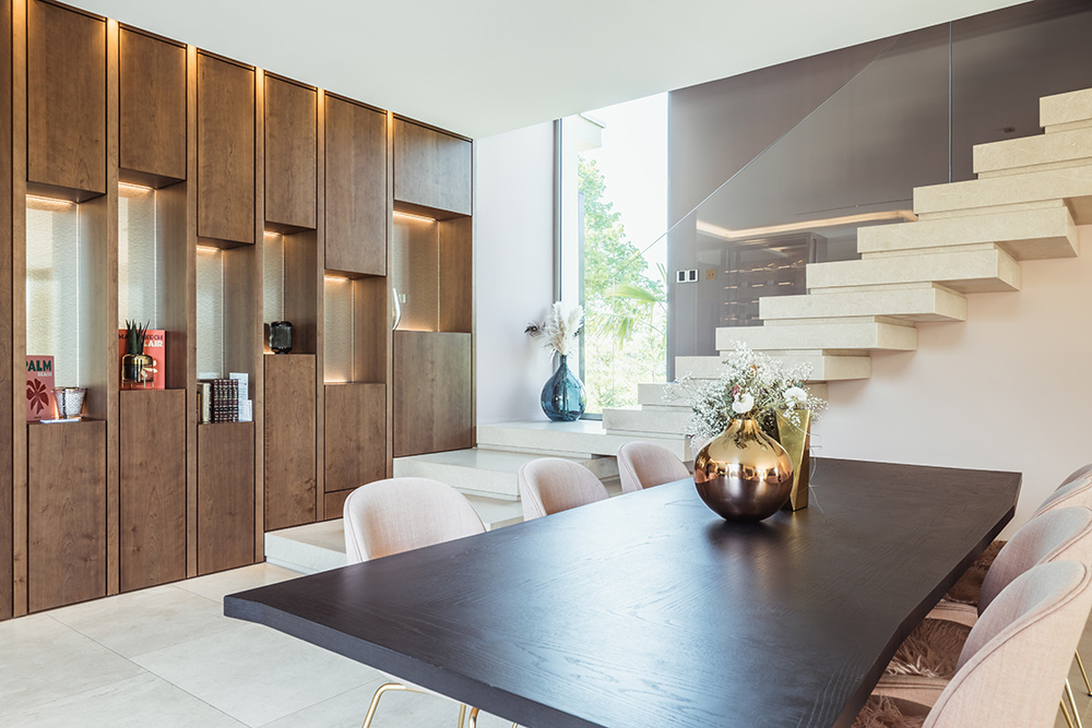 Les aménagements s’inscrivent dans une architecture classique revisitée par un travail précis sur les matières, les proportions et les détails. Bois foncé, pierre, textiles muraux et éléments métalliques composent une palette sobre et élégante, où chaque mobilier trouve sa place sans rompre l’équilibre des espaces.