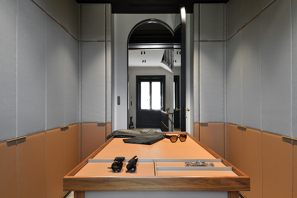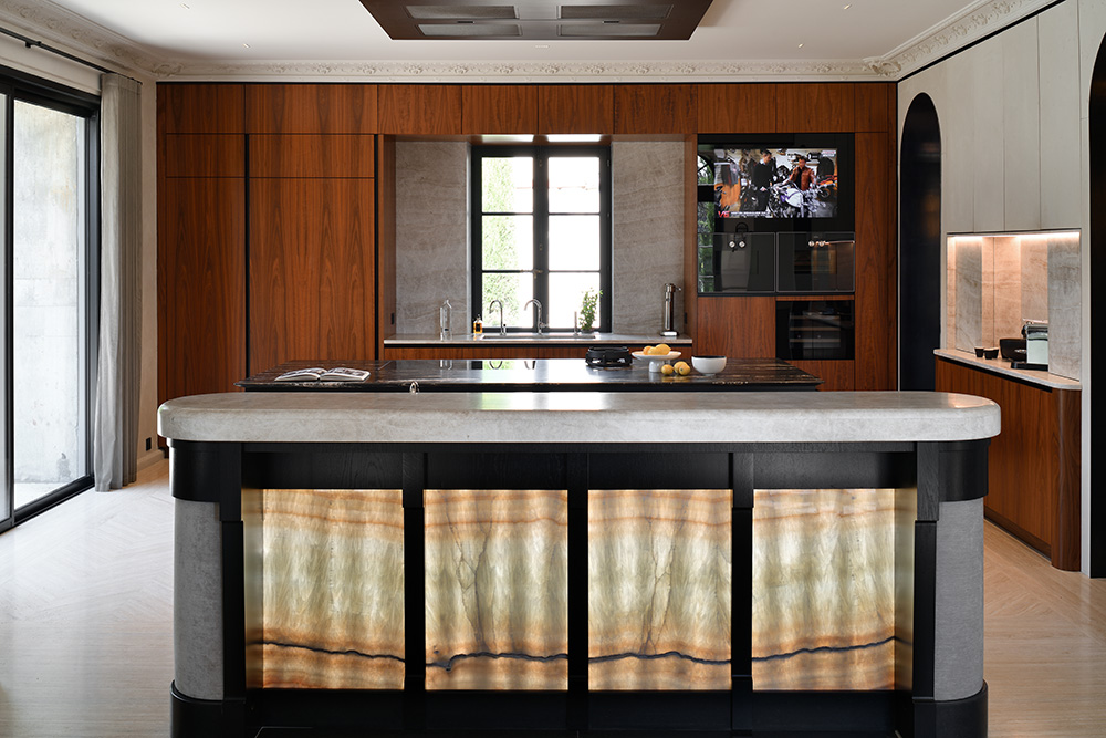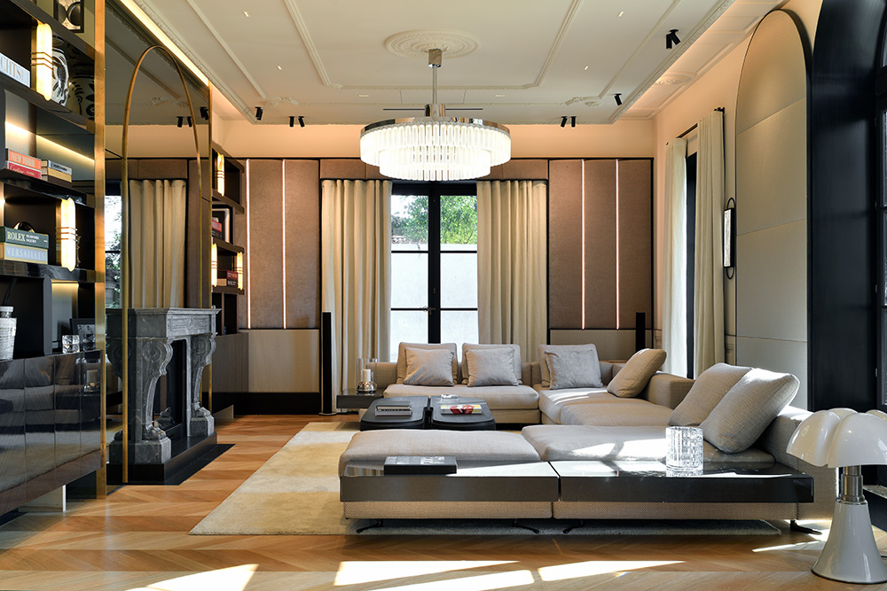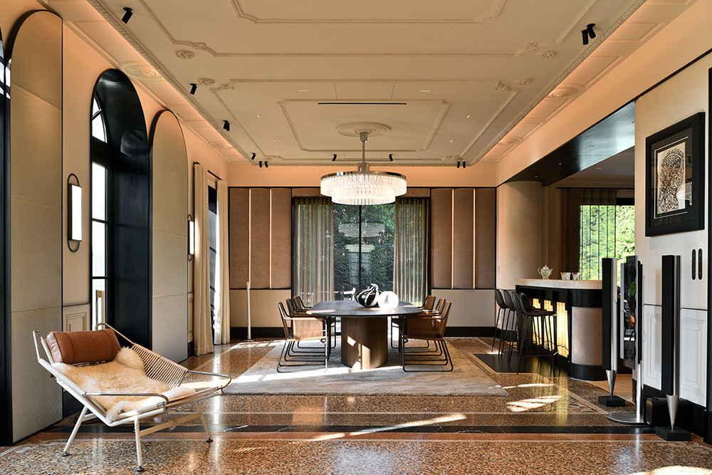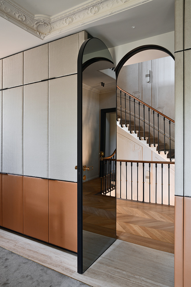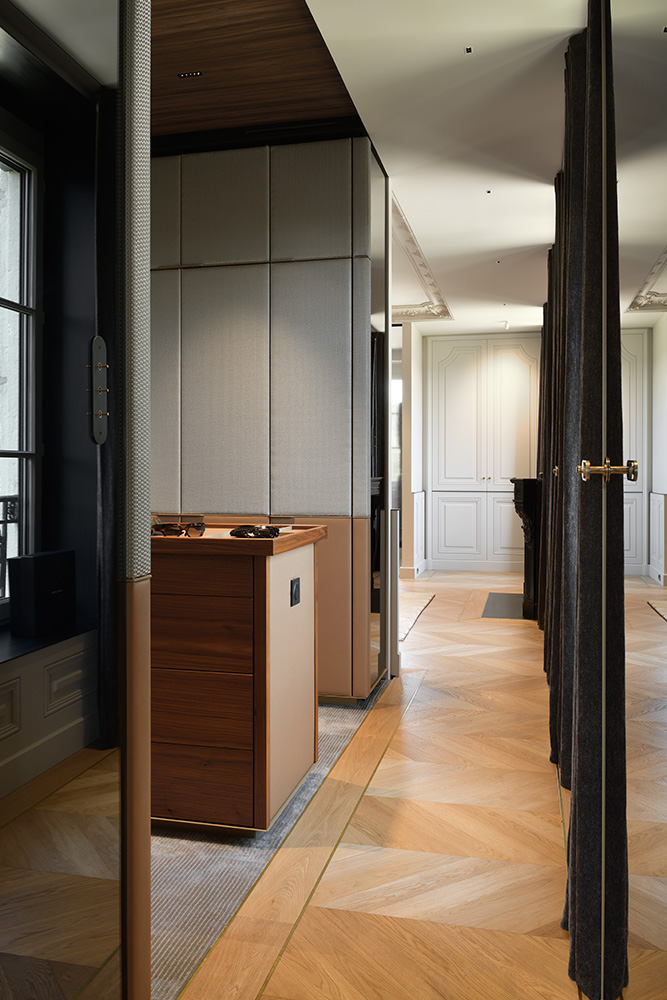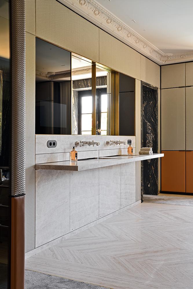 Les aménagements s’inscrivent dans une architecture classique revisitée par un travail précis sur les matières, les proportions et les détails. Bois foncé, pierre, textiles muraux et éléments métalliques composent une palette sobre et élégante, où chaque mobilier trouve sa place sans rompre l’équilibre des espaces.